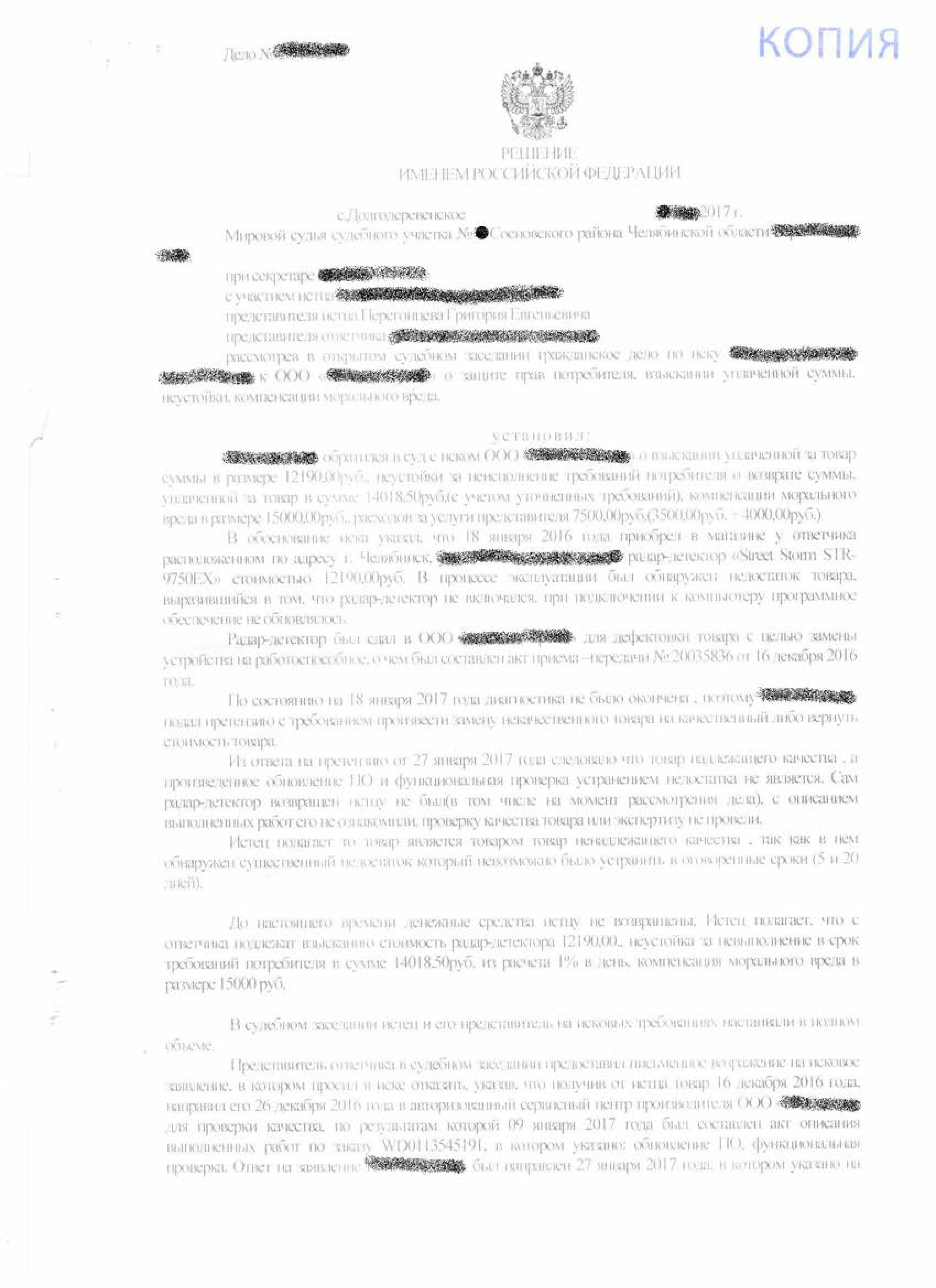 Наши юристы, ознакомившись с ситуацией, разработали правовую позицию по делу, подготовили исковое заявление о взыскании с продавца товара стоимости радар-детектора, неустойки и компенсации морального вреда. Представитель ответчика в суде возражал и настаивал отказать в исковых требованиях, поскольку со своей стороны произвел все работы и не нарушал срок гарантийного обслуживания. Суд, рассмотрев все материалы дела, вынес решение об удовлетворении исковых требований.